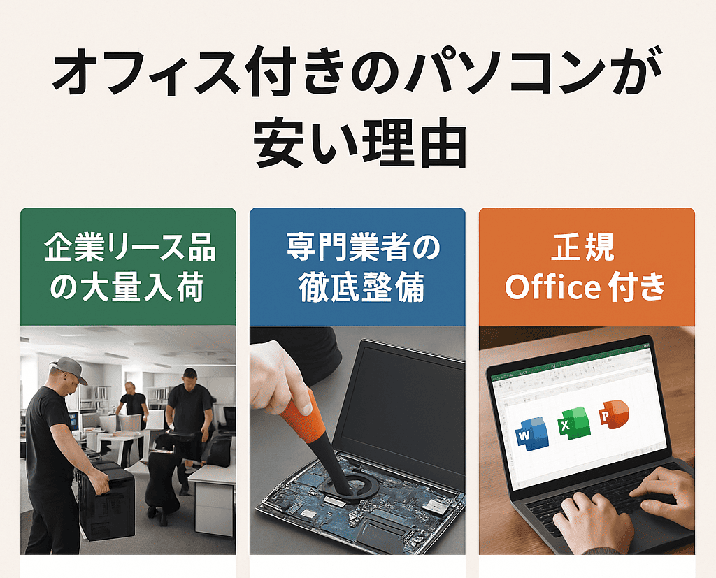 オフィス付き中古パソコンが安く販売されている理由は、企業のリースアップ品や大量入荷によるコスト削減が主な要因です。